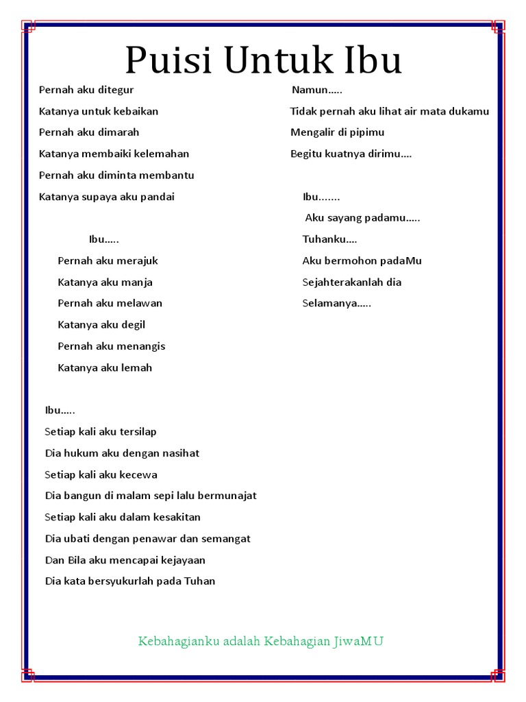 Kumpulan contoh puisi ibu. Berbicara tentang puisi ibu ada berbagai macam puisi ibu atau bunda ada yang sedih menyentuh hati ada pula yang mengharukan begitu besar pengorbanan seorang ibu tercinta dalam kehidupan sehingga puisi yang menceritakan tentang ibu yang kita cintai bermacam macam sebagai penghargaan seorang penulis puisi untuk ibunya atau sebagai rasa terima kasih seorang anak yang diaplikasikan dalam bentuk kata kata bijak kata motivasi dan kata mutiara dan bait. Engkau ajarkan aku tentang cinta.
