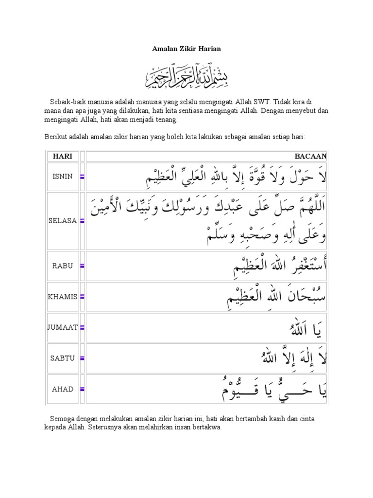 Zikir harian nabi muhammad saw wajib dijadikan contoh dan suri tauladan bagi kehidupan sehari hari. Amalan zikir adalah amalan untuk mendidik hati agar sentiasa mengingati allah s w t. Zikir harian ini boleh diamalkan pada waktu pagi dan petang.