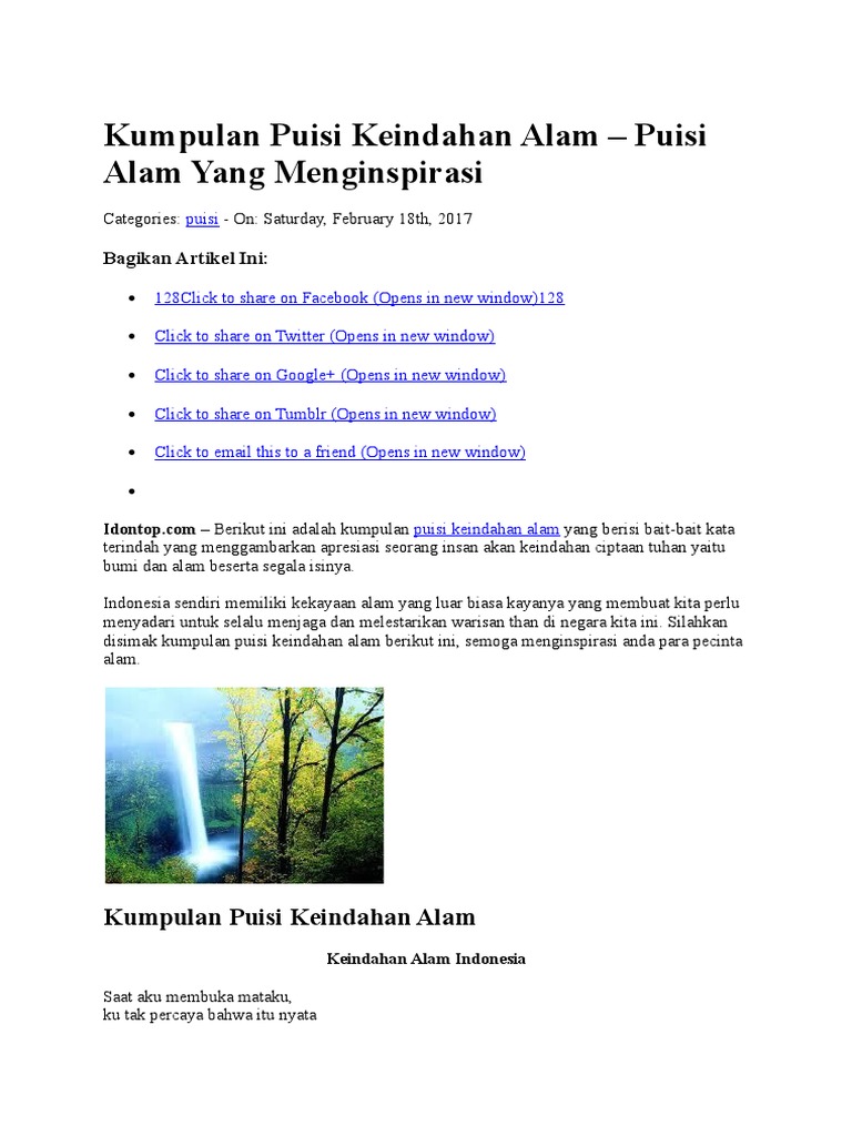 6 contoh puisi tentang keindahan alam indonesia puisi merupakan salah satu bentuk seni yang mendayagunakan tulisan sebagai mediumnya sastra. Itulah contoh puisi tentang alam. Keindahan alam di indonesia memang terkenal sangat indah sehingga cocok untuk dijadikan bahan puisi.