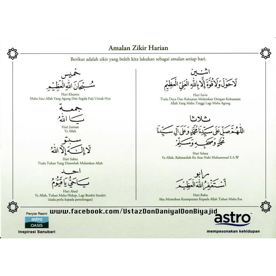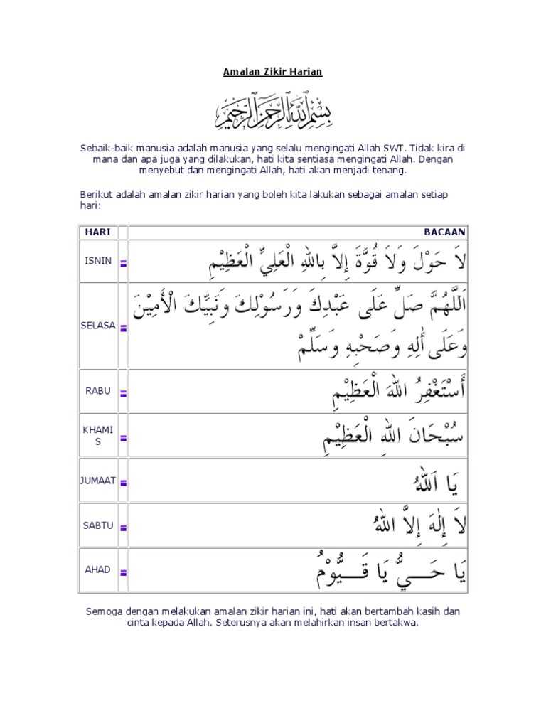 Jadi marilah kita bersama sama mengamalkannya supaya kita akan mendapat kebaikan di dunia dan di akhirat. Ada sebagian pendapat maaf orang tua dulu yang beranggapan bahwa ada hari hari jelek ada hari hari baik keberuntungan hari hari sakral dan hari hari naas padahal sejatinya allah yang maha kaya menciptakan 7 hari dalam seminggu itu sebenarnya. Ada beberapa bacaan dzikir yang bisa kita lantunkan setiap hari hingga 100 kali menurut petunjuk nabi muhammad saw.