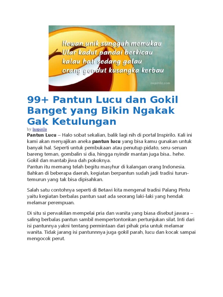Pantun lucu banget bikin ngakak. Pantun cinta perkenalan lucu banget. Pantun pantun itu bisa kamu tiru plek ataupun hanya jadikan inspirasi untuk kemudian kamu kreasikan pantun versimu sendiri yang gak kalah lucu.