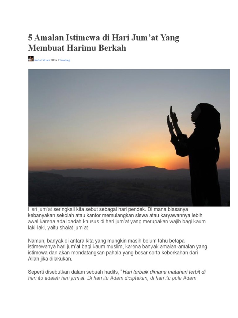 Sering dilakukan baginda rasul ini amalan istimewa di hari jumat sumber pahala di hari baik. Pada hari jumat allah menciptakan nabi adam dan mengeluarkannya dari surga ke bumi. Di hari ini umat islam dianjurkan memperbanyak amalan ibadah dan.
