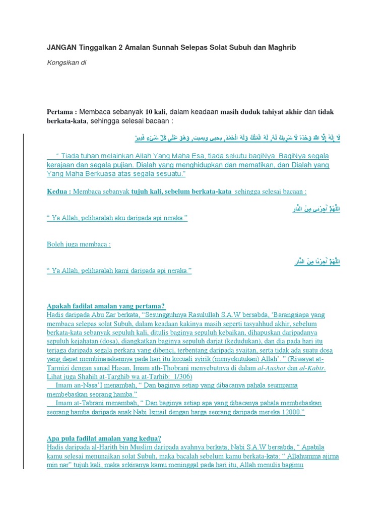 Amalan setelah sholat magrib dan subuh. Solat sunat sebelum subuh selepas fajar sadiq. Rasulullah saw bahkan mengatakan bahwa allah menjamin pengabulan doa yang dibaca sesudah sembahyang wajib lima waktu. Adapun berikut ini adalah rangkaian dzikir dan wirid yang perlu dibaca sesudah sembahyang maghrib dan subuh.