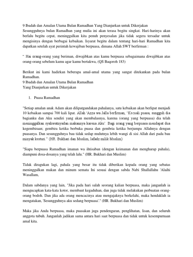 Amalan ibadah utama bulan ramadhan sesungguhnya bulan ramadhan yang mulia ini akan terasa begitu singkat. Rasulullah shallallahu alaihi wasallam bersabda berpuasalah kalian pada hari asyura. Bulan ini juga dipenuhi gemilang keberkahan amalan amalan lainnya.