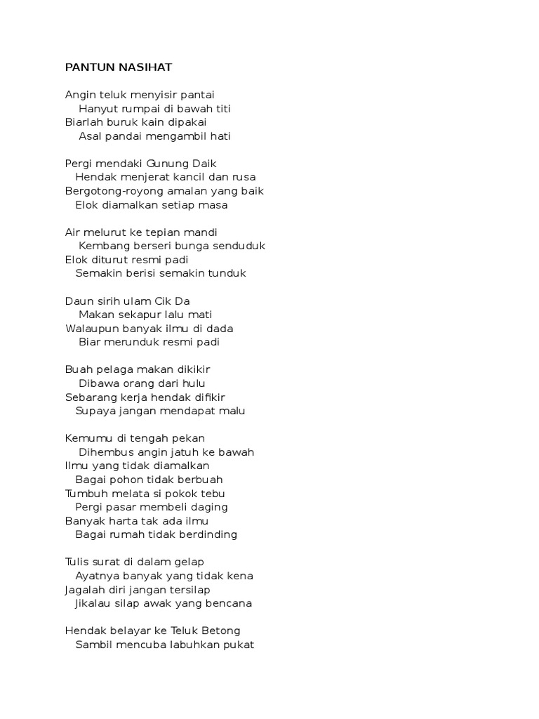 Kumpulan koleksi contoh pantun nasehat orang tua anak anak belajar pendidikan agama pantun nasehat orang tua adalah pantun yang isinya merupakan nasehat nasehat atau wejangan dari orang tua yang biasanya ditujukan untuk anak anaknya. Pantun nasehat dapat berisi tentang tuntunan kebaikan untuk anak agar kelak menjadi pribadi yang lebih baik.