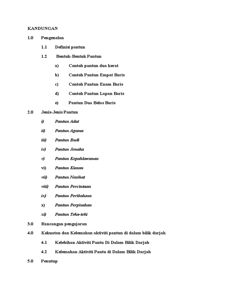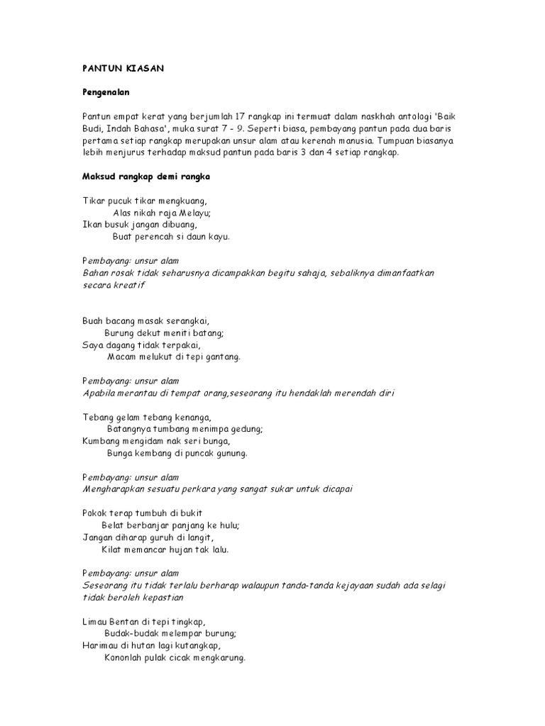 Pantun kiasan 4 baris. Pantun merupakan jenis puisi lama yang mempunyai ciri khas terdiri atas 4 baris yang bersajak a b a b dan juga terdiri atas sampiran dan isi. Pantun tanpa mengira dalam bentuk dua enam atau pantun empat kerat merupakan rakaman pengalaman dan pemerhatian orang orang lama dalam kehidupan seharian.