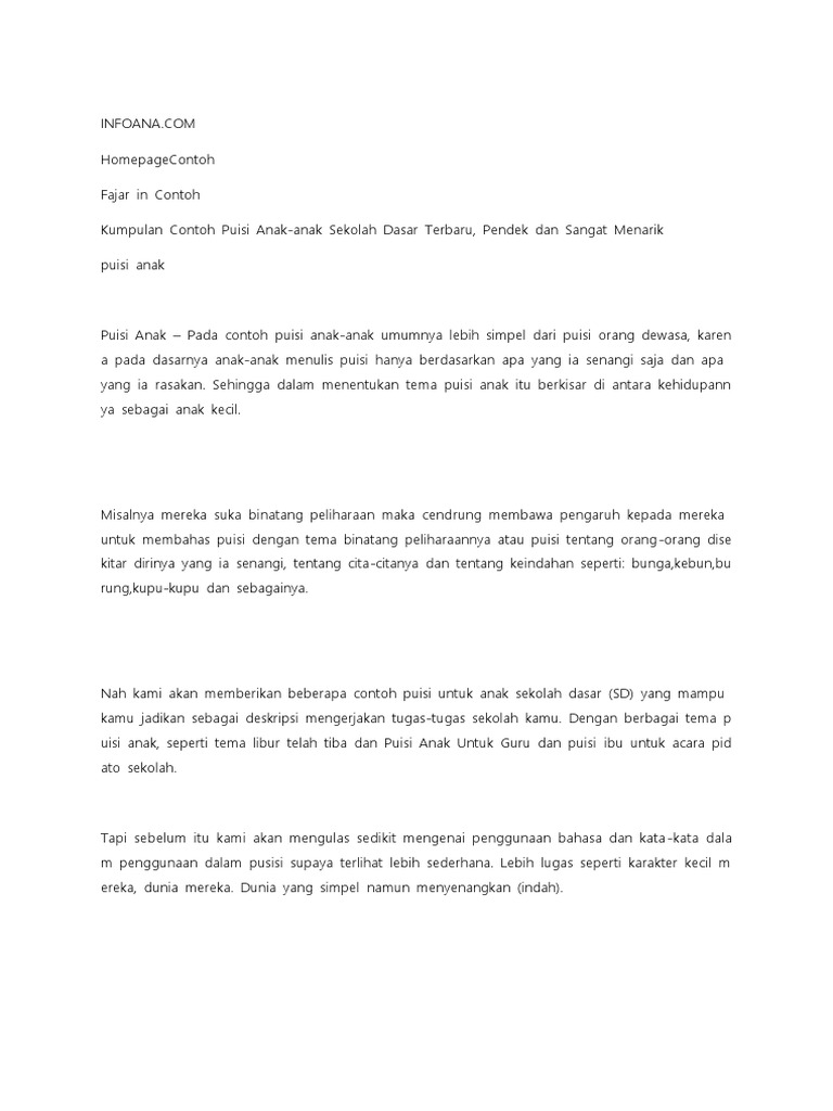 Contoh puisi pendek untuk anak sd kelas 1. 35 puisi ibu untuk anak sd kelas 1 2 3 4 5 dan 6 klak klik bermutu. Misalnya mereka suka binatang peliharaan maka cendrung membawa pengaruh. Namun pertemanan kami meningkat.
