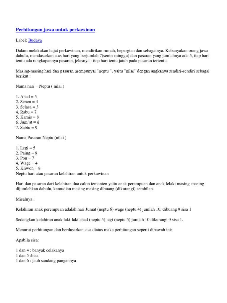 Perhitungan Jawa Untuk Perkawinan