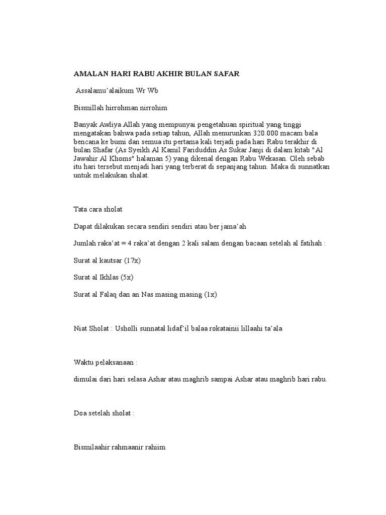 Amalan di akhir bulan safar. Mereka pun melakukan amalan amalan tertentu guna menghindari bala tersebut. Sedangkan kepercayaan tentang masalah sial atau bala merupakan kepercayaan dari orang jahiliyyah sebelum islam datang seperti contohnya mandi di sungai atau di pantai pada bulan safar yang berkaitan dengan kepercayaan nenek moyang terdahulu dan juga. 11 7 2018 sekarang adalah rabu terakhir di bulan safar.