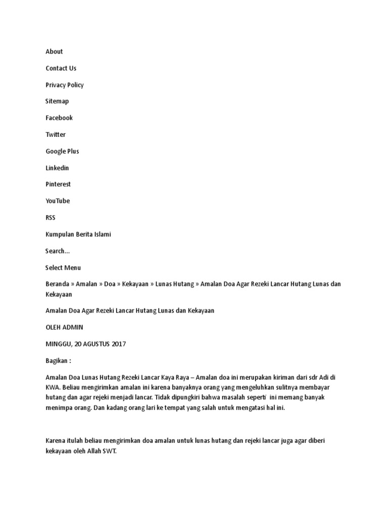 Amalan doa rezeki lancar lunas hutang dan kaya raya papar berkaitan pada 13 6 2019 jumlah. 299 hits amalan doa ini merupakan kiriman dari sdr adi di kwa beliau mengirimkan amalan ini karena banyaknya orang yang mengeluhkan sulitnya membayar hutang dan agar rejeki menjadi lancar tidak dipungkiri bahwa masalah seperti ini memang banyak meni. Soalnya deadline saya hanya 7 hari.