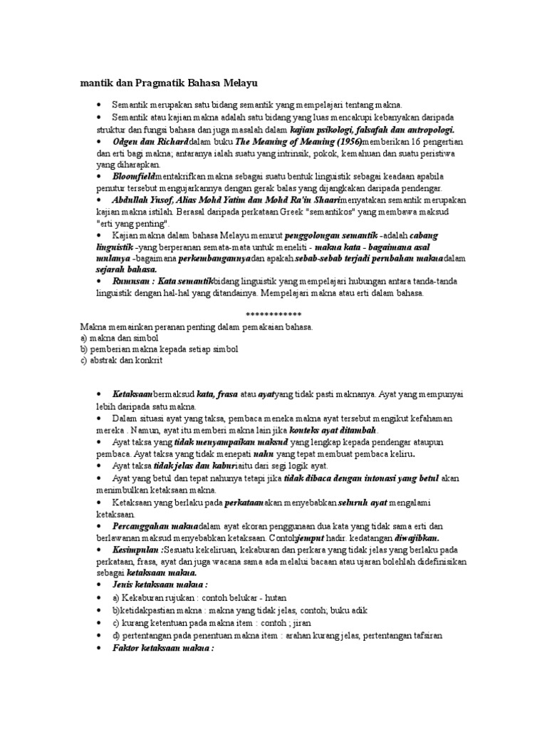 Semantik Dan Pragmatik Bahasa Melayu Semantik Merupakan Satu Bidang Semantik Yang Mempelajari Tentang Makna