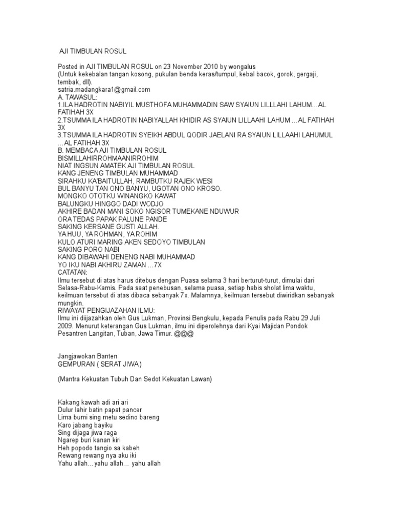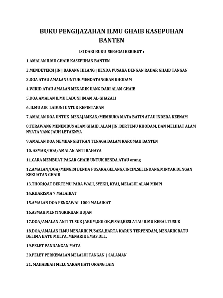 Amalan ilmu kebal banten. Doa mustajab 215 343 views. Tubagus arsyad dari banten membawanya sampai di daerah citeko plered purwakarta di tempat inilah tubagus sayida bertemu dan menikah dengan umi dan di daerah ini pula seorang bayi yang diberi nama ahmad bakri dilahirkan ahmad bakri muda mendapatkan pendidikan agama dari keluarga untuk menambah wawasan dan ilmu keislaman ia belajar di. Kitab keramat kasepuhan komplit ilmu khos kasepuhan banten berisi.