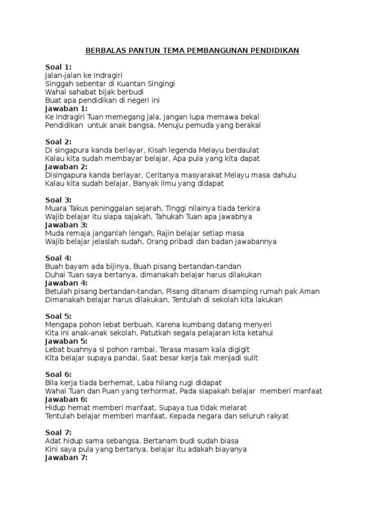Satu titik dua koma anak monyet memanfaatkan gincu lihat anak kelas lima. Bangun pagi di hari jumat ambil mesin pergi membabat. Contoh pantun pendidikan berdasarkan dari isi dan tujuannya dibuat pantun dibagi menjadi beberapa macam antara lain pantun nasehat pantun jenaka pantun percintaan pantun muda mudi pantun bertema pendidikan dan lain lain.