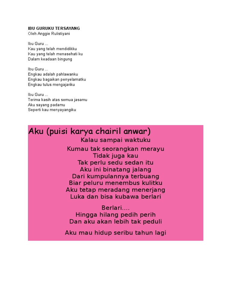Guruku tersayang puisi untuk guru. Guru mempunyai peran penting dalam mencerdaskan kehidupan bangsa khususnya dalam mengajar dan memberi contoh yang baik kepada para anak didiknya. Guru guru seperti ini harus mempunyai semacam kualifikasi formal. Meski terlihat sederhana namun hal yang dibuat dengan hati akan lebih terasa bermakna.