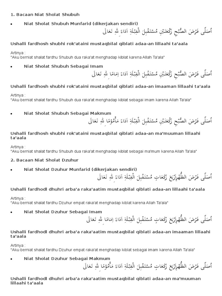 Berikut niat sholat subuh baik dilaksanakan sendiri atau berjamaah menjadi imam atau makmum. Terjemahan arti bacaan niat shalat subuh sendiri aku niat melaksanakan sholat fardhu subuh sebanyak dua rakaat sambil menghadap kiblat saat ini karena allah ta ala b.