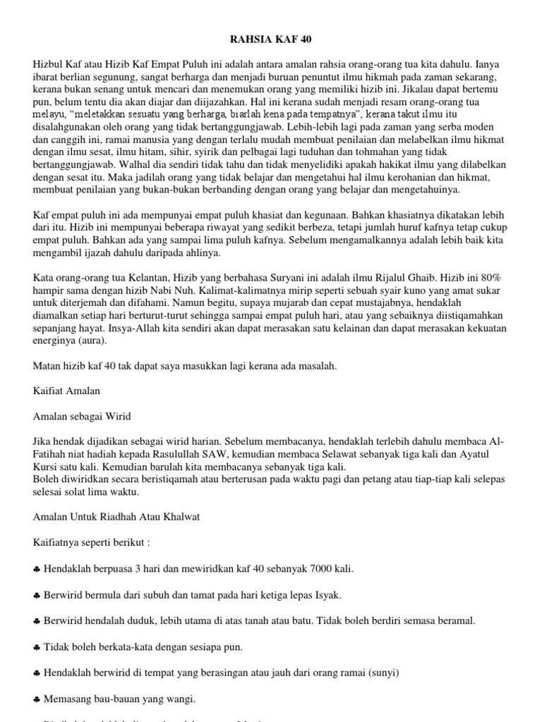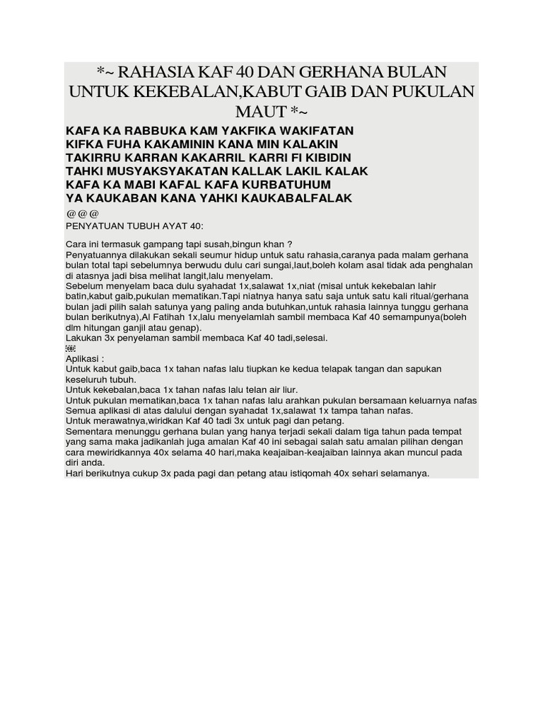 Amalan kaf 40 adalah dalam bahasa ibrani atau suryani. Ilmu itu berasal dari pengisian oleh guru atau amalan wirid dan riadah. Ini kaf 40 yg sy miliki selama ini kata yg ngasi ilmu ni multifungsi kaffaka robbuka kamyakfika wakifatan kifkafaha kakaminin kanamin kalakin tukiron kiron kakaril karil fikabadi tuhki musyak syakatan kalakin laka luki kaffa kamabi kafakal kahfi kurbatuhu yakau kabu kana tahki kaukabil falki dan untk kaf 100 tarik nafas terus tahan baca kaf 40.