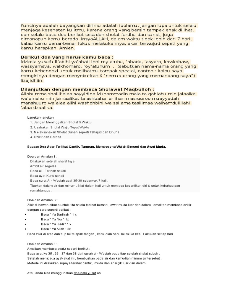 Amalan doa agar wajah terlihat tampan manis dan cantik oktober 14 2017 add comment edit bagikandakwah sahabat dakwah amalan yang satu ini digunakan sebagai pengasihan tentu tidak diragukan lagi mengenai khasiat yang akan didapat karena sudah teruji ribuan orang yang mungkin pernah merasakan kedahsyatan dari doa nabi yusuf. Wajah pria yang awalnya biasa saja ketika sudah mengamalkan doa nabi yusuf ini secara rutin akan nampak lebih berseri lebih.