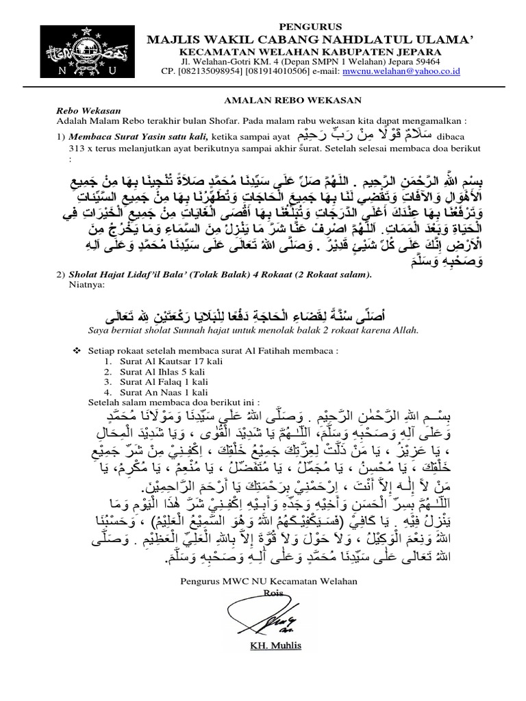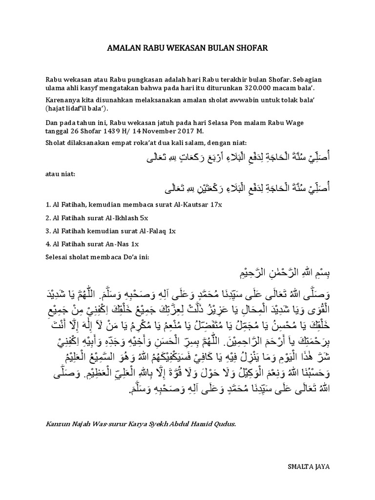 Selain doa rebo wekasan diatasm ada amalan lain yang juga sangat dianjurkan oleh para ulama khususnya oleh ustadz ubaidillah arsyad sebagai berikut. Asalkan tidak menganggap itu hak yg wajib. Amalan dan doa rebo wekasan akhir shofar ma had aly syafiiyah akurat co rebo wekasan atau hari rabu akhir di bulan shofar dikenal sebagian ulama sebagai rabu yang akan diturunkannya musibah.