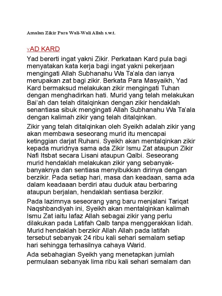 Perkataan kard pula bagi menyatakan kata kerja bagi ingat yakni pekerjaan mengingati alla. Y ad kard yad bererti ingat yakni zikir. 1 as saabiquun al muqorrobun wali allah terdepan dan 2 al abror ash habul yamin wali allah pertengahan.