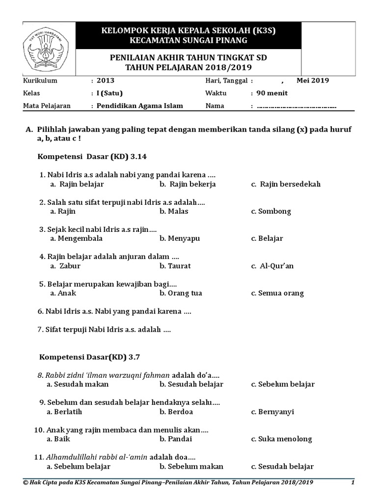 Soal Pts Pai Semester Ii Kelas 1 K13