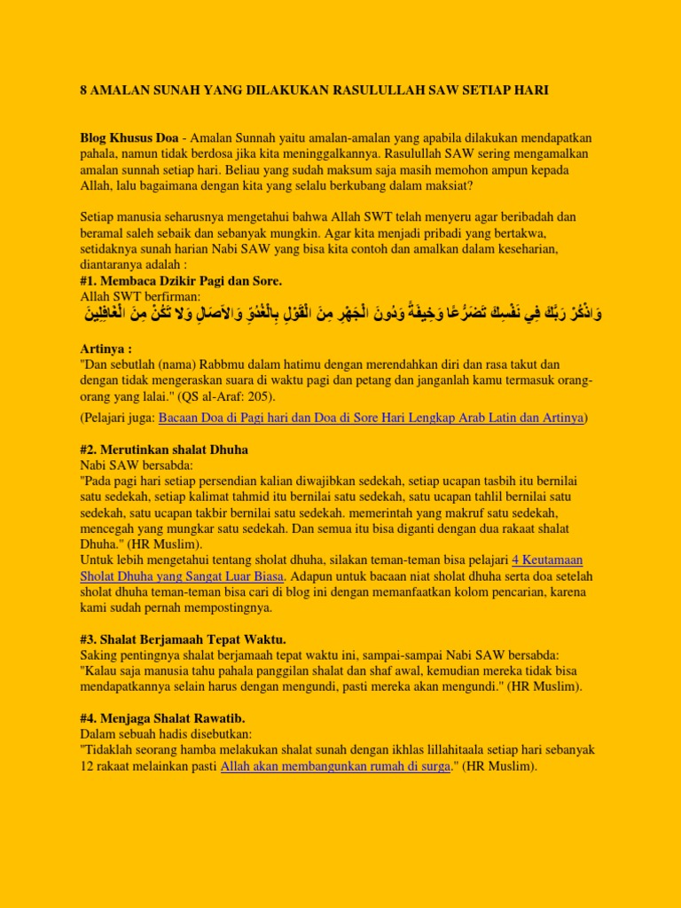 8 amalan sunah yang dilakukan rasulullah saw setiap hari yuk amalkan juga. Segala perbuatan tingkah laku akhlak yang ada pada diri rasulullah muhammad saw adalah sebagai teladan atau panutan untuk kita yang sesuai sunnah.